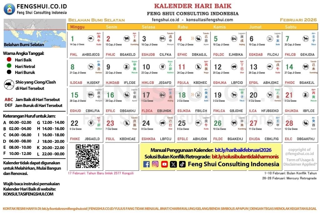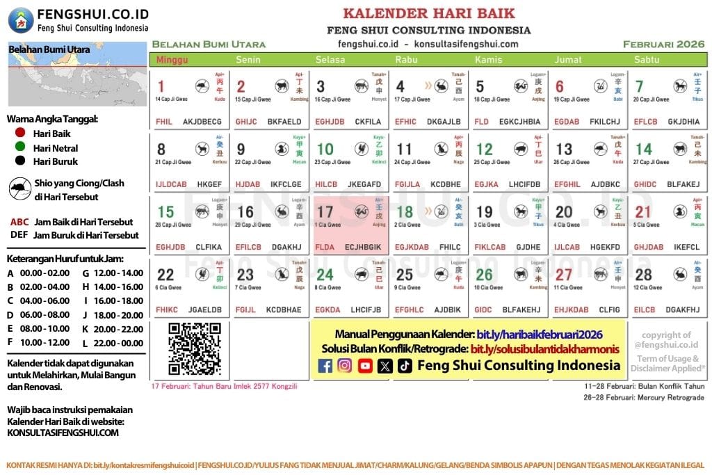 Artikel Kalender Hari Baik Februari 2026 ini adalah Copyright atau Hak Kekayaan Intelektual (HAKI) milik Feng Shui Consulting Indonesia. Kalender ini dilarang untuk diperjualbelikan/dikomersilkan. Dilarang mengutip semua atau sebagian isi dari kalender ini tanpa izin tertulis dari Feng Shui Consulting Indonesia.
